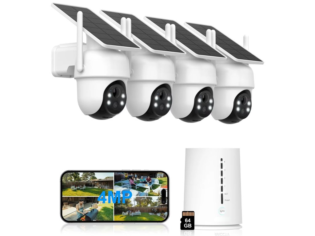 Bezdrátový IP WiFi kamerový systém ANRAN ANRAN W40-Q04 se 4 kanály, připravený k okamžitému použití v režimu Plug&Play, složený z bateriových kamer se solárním dobíjením a NVR jednotky.