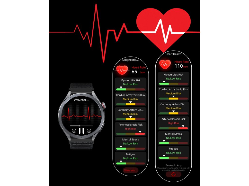 EKG (elektrokardiogram) - měření elektrické aktivity srdce. Chytré hodinky HEATLH E472 Fit využívají nejnovější metodu přesného měření EKG pomocí senzorů ECG (elektrografii) a PPG (fotopletysmografii) pro vytvoření detailního grafu pravidelnosti a frekvence srdečního rytmu. Pro maximální přesnost kombinují měření přes elektrodu na boční straně pouzdra hodinek s měřením optickým senzorem na spodní straně.