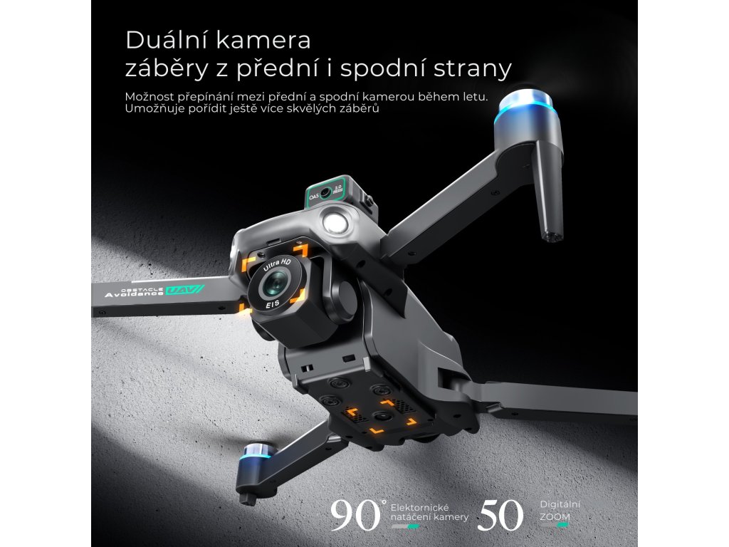 Dron má dvě kamery mezi kterými můžete během letu přepínat a zachytit tak každý okamžik z těch nejlepších úhlů. Přední kamera snímá Full HD video a 4K fotografie se širokoúhlým záběrem 120°. Videa i fotografie budou vždy ostrá a plynulá i v náročných podmínkách díky EIS elektronické stabilizaci obrazu. Pro ještě lepší výsledek záznamu využívá dron čip s AI, která pořízené video po uložení upraví. Ideální úhel záběru nastavíte během letu přímo na dálkovém ovladači. S kamerou můžete plynule pohybovat v rozsahu 0-90°. Doplňkové spodní kameře neuniknou žádné záběry z míst, která by jinak zůstala skrytá.