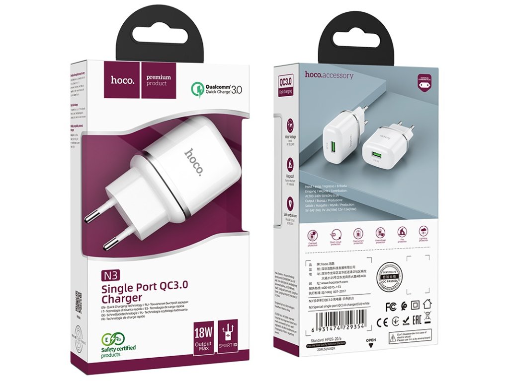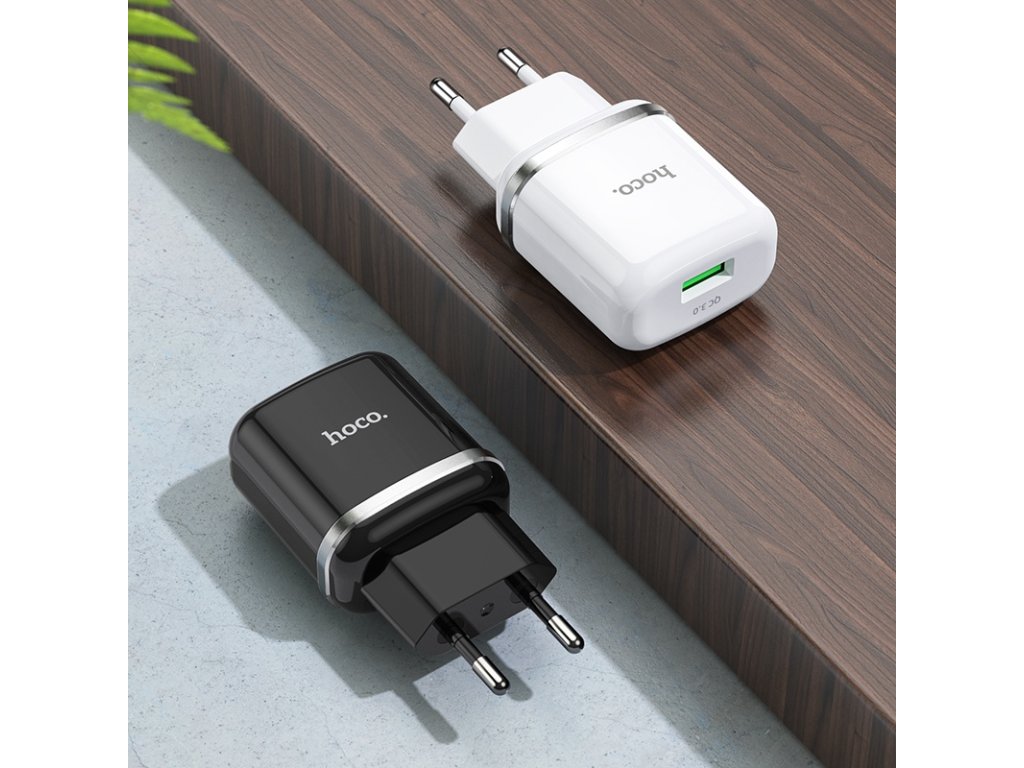 Nabíjecí adaptér od značky Hoco z pevného polykarbonátu. Je zde jeden výstupní USB port, který podporuje rychlé nabíjení QC3.0. Je možné tedy nabíjet výkonem až 18 W. Adaptér disponuje ochranou proti zkratu, přepětí, přetížení a přehřátí.