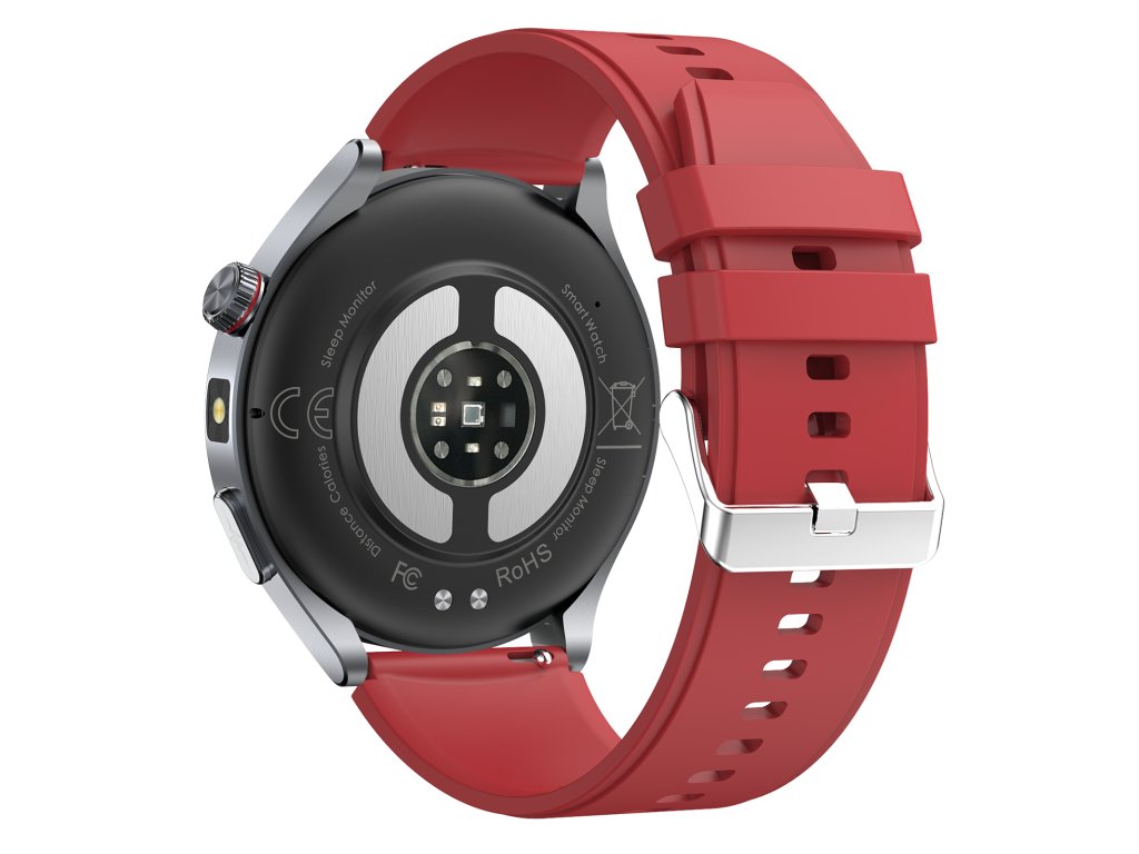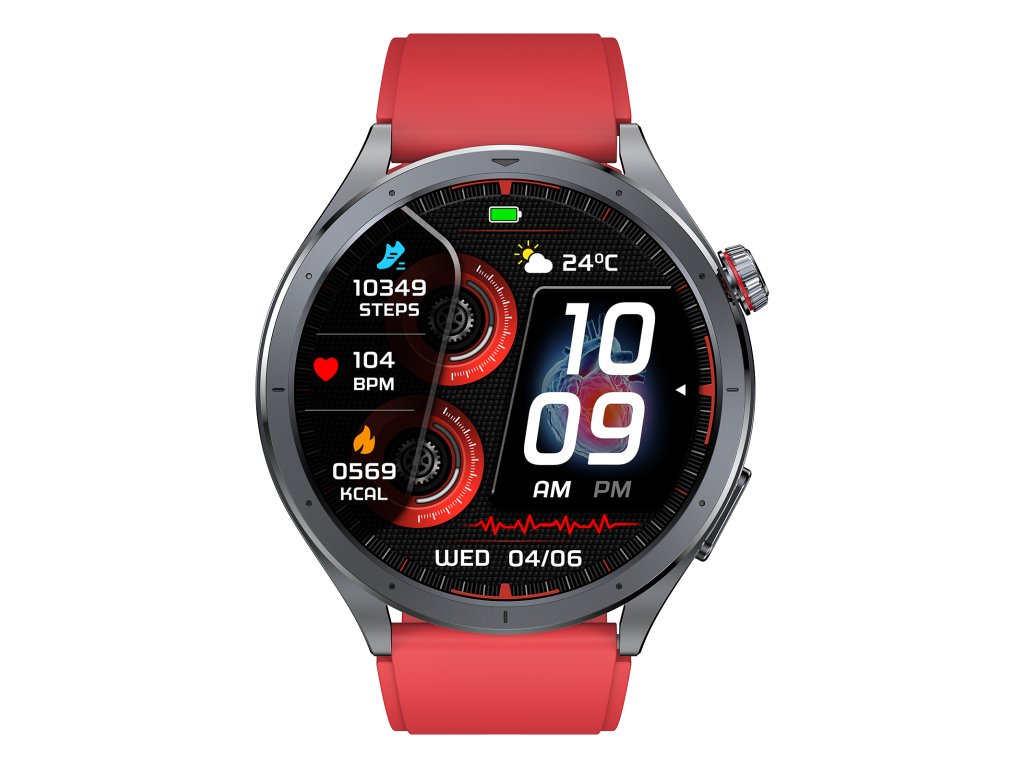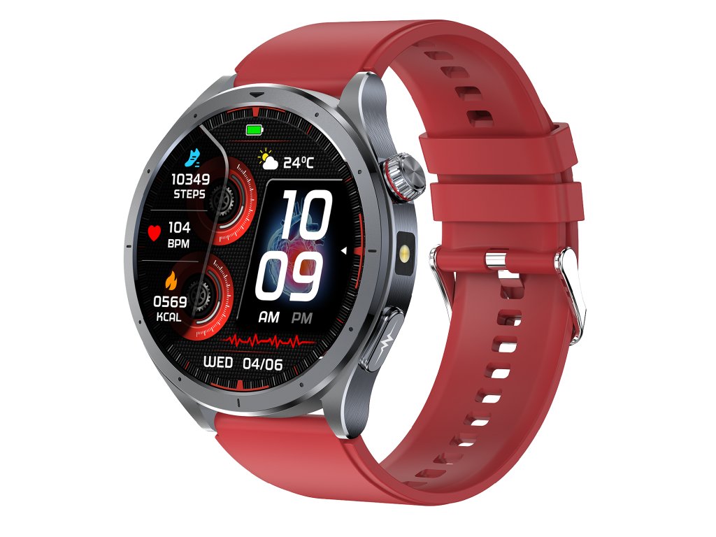 Chytré hodinky Lige HEATLH ET472 Fit s červeným silikonovým řemínkem a množstvím funkcí pro detailní analýzu pohybu i zdraví. Neinvazivní měření hladiny cukru v krvi, srdečního tepu, HRV, krevního tlaku, EKG, složek krve, složení těla, tělesné teploty, stresu, rychlosti metabolizmu, okysličení krve a kvality spánku.