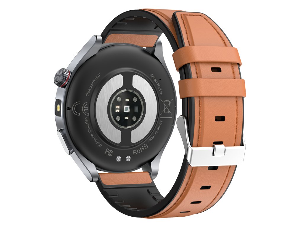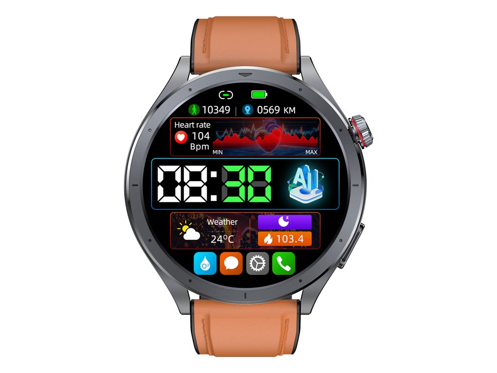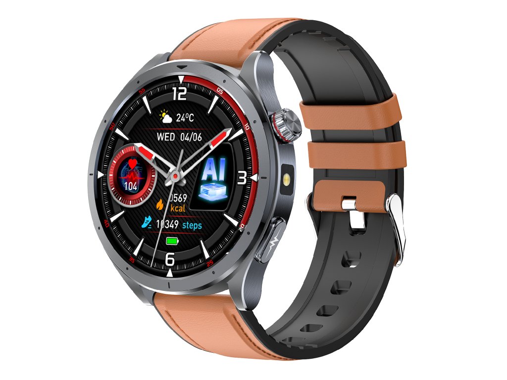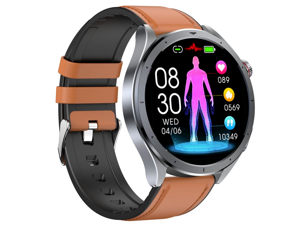 Chytré hodinky Lige HEATLH ET472 Fit s hnědým koženým řemínkem a množstvím funkcí pro detailní analýzu pohybu i zdraví. Neinvazivní měření hladiny cukru v krvi, srdečního tepu, HRV, krevního tlaku, EKG, složek krve, složení těla, tělesné teploty, stresu, rychlosti metabolizmu, okysličení krve a kvality spánku.