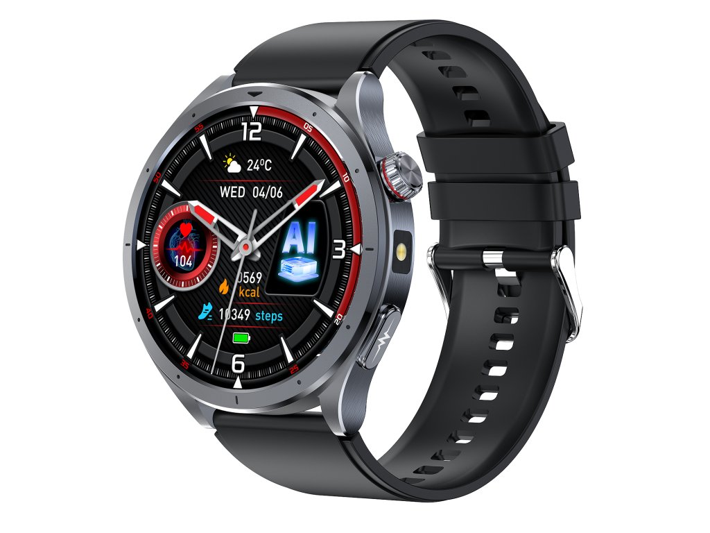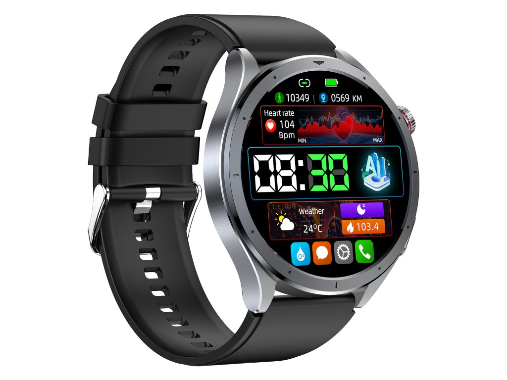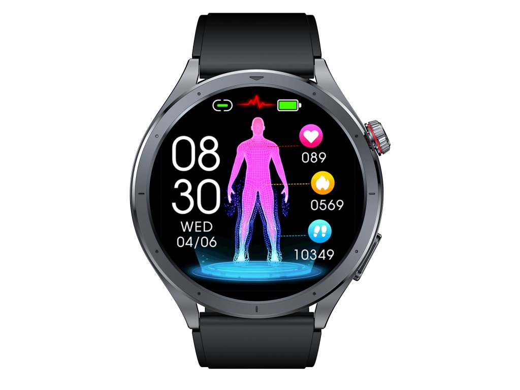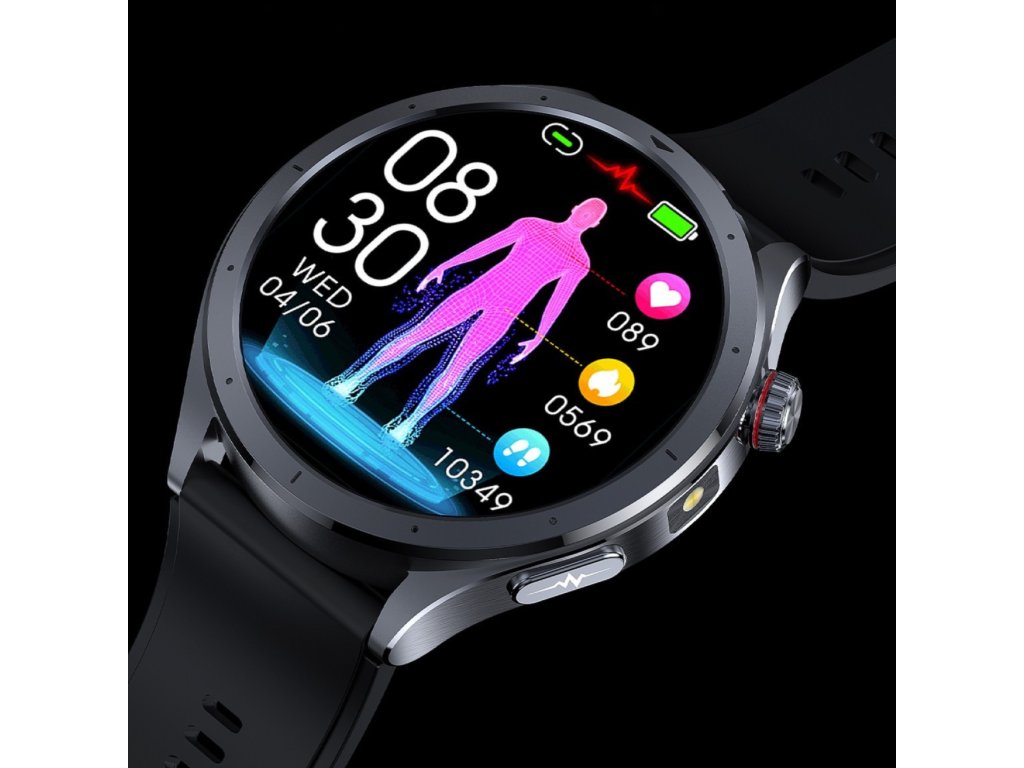 Chytré hodinky Lige HEATLH ET472 Fit s černým silikonovým řemínkem a množstvím funkcí pro detailní analýzu pohybu i zdraví. Neinvazivní měření hladiny cukru v krvi, srdečního tepu, HRV, krevního tlaku, EKG, složek krve, složení těla, tělesné teploty, stresu, rychlosti metabolizmu, okysličení krve a kvality spánku.