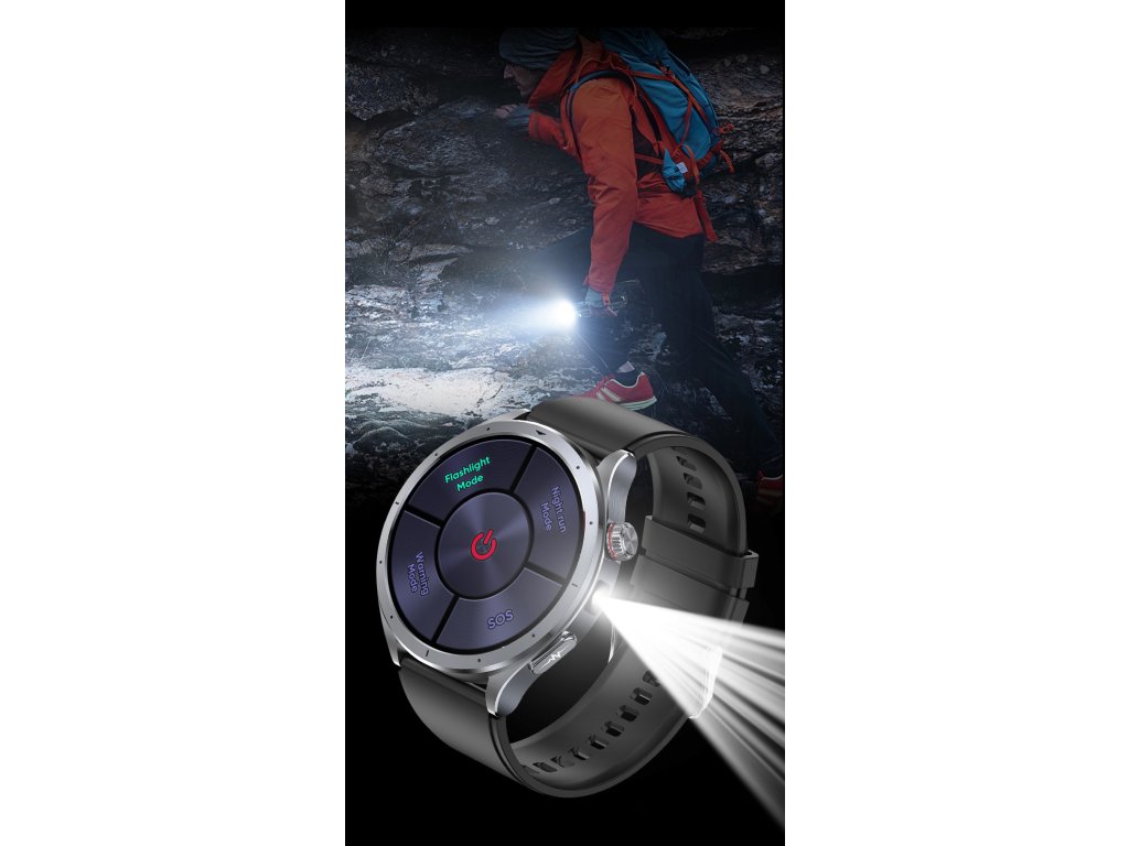 Na boku pouzdra mají hodinky Lige HEALTH ET472 Fit výkonnou LED svítilnu se svítivostí 400 lm, která je praktickým pomocníkem v každé situaci. Nabízí čtyři režimy svícení – klasické bílé světlo, režim pro noční běh, výstražné blikání a pomalé SOS blikání pro nouzové situace.