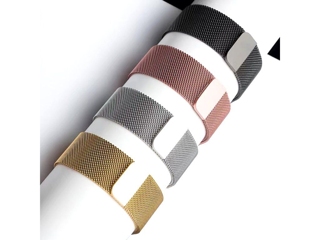 Ocelový řemínek milánský tah s magnetickým zapínáním / dokonale se přizpůsobí obvodu a tvaru zápěstí / barva růžové zlato (rose gold) / ušlechtilá ocel s povrchovou úpravou / šířka 22mm / nastavitelná délka na obvod zápěstí v rozmezí 10 až 18cm / snadné připnutí a výměna pomocí univerzálních rychloupínacích osiček Easy-clic