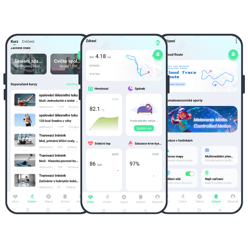Pro pravidelný pohyb naleznete v hodinkách i mobilní aplikaci množství cvičebních kurzů. Od krátkého protažení, správného držení zad, formování postavy, zpevnění vnitřního svalstva až po hubnutí a nabírání svalové hmoty.