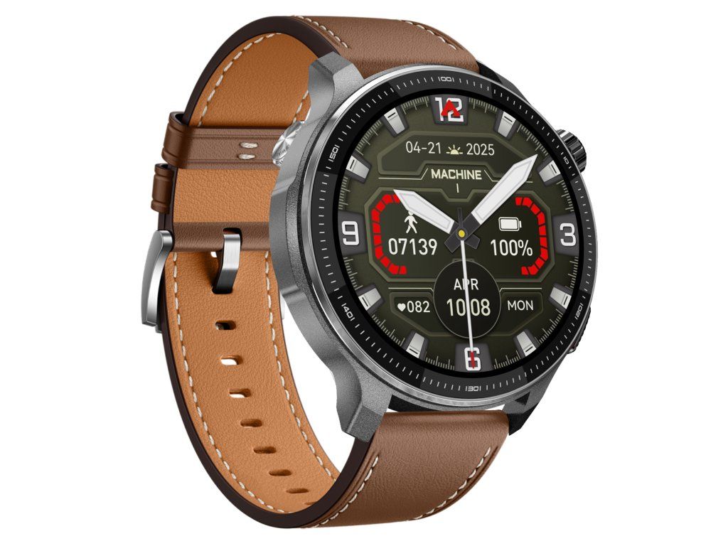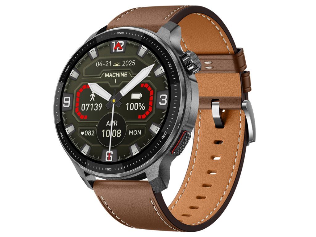 Chytré hodinky PulsGo EVOLVE G6 Ultra s elegantním tenkým pouzdrem z nerezové oceli, AMOLED displejem a hnědým koženým řemínkem.