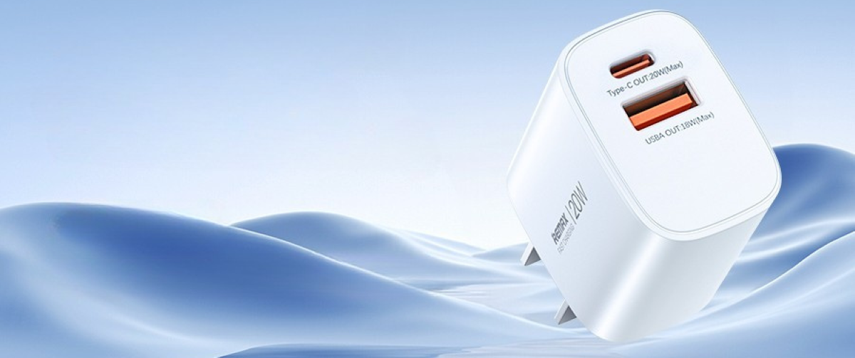 GaN napájecí adaptér REMAX U187-C20W s dvěma napájecími porty USB-A a USB-C. Podpora Quick Charge 3.0 (QC 3.0) a Power Delivery 20W (PD20W)