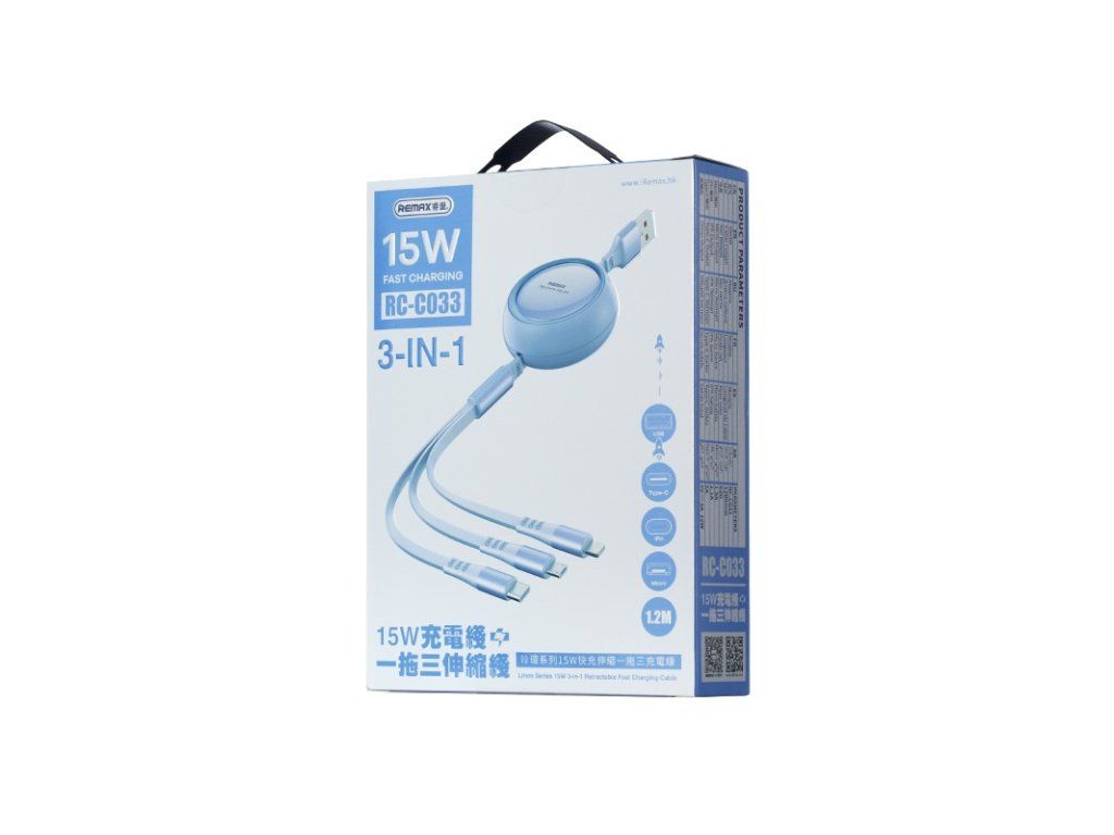 S multifunčním napájecím a datovým kabelem REMAX C033 můžete pohodlně nabíjet až tři zařízení najednou. Kabel má konektory USB-C, Lightning a micro USB, takže snadno nabijete většinu telefonů a další elektroniky. S podporou rychlého nabíjení až 15W navíc nabízí stabilní a bezpečný výkon i s adaptéry s vyšším výkonem.