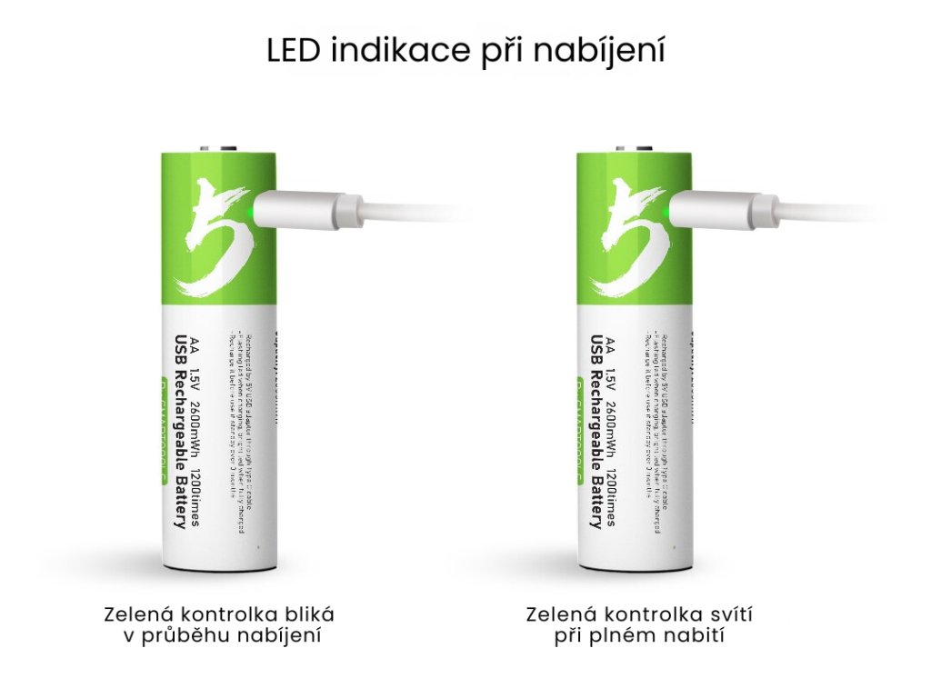 Baterie je vybavena LED indikací stavu nabíjení. Pokud bliká zelená kontrolka, baterie se dobíjí. Jakmile se zelená kontrolka rozsvítí, je baterie plně nabitá. Součástí balení je napájecí kabel s rozbočením pro pohodlné nabíjení všech 2 kusů baterií najednou.