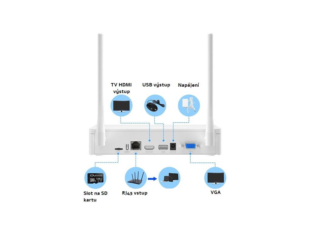 NVR má 1x USB 2.0 vstupu, 1x HDMI výstup, 1x VGA výstup a vstup pro datový kabel RJ45. Prostřednictvím USB vstupu lze připojit myš, nebo stáhnout záznam z disku přímo na flash disk.