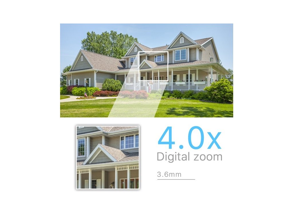 Objektiv kamery s čočkou 3,6mm a CMOS senzore Sony je schopen snímat obraz v úhlu záběru 90°. Kamery umožňují přiblížení obrazu ve formě optického ZOOMU. Obraz lze přiblížit až 4x bez ztráty kvality záznamu.