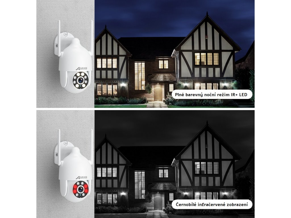 Kvalitní obraz zaznamenávají kamery Anran také v noci a při snížené viditelnosti. Každá kamera má 4x IR diodu a 4x diodu s LED bílým svícením. Kamery tak umožňují záznam plně barevného i infračerveného nočního záznamu. V systému lze nastavit 3 noční režimy: