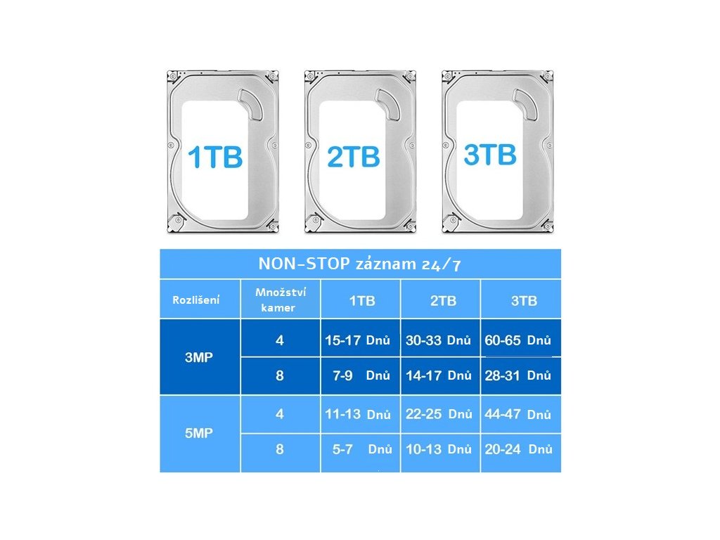 Při využité nejčastější kapacity úložiště 1TB a zapojení 8 kamer lze uchovávat non-stop celodenní záznam včetně zvuku v plné kvalitě po dobu až 7 dnů. Úložiště lze dle potřeby rozšířit výměnou za disk s podporovanou kapacitou až 4TB.